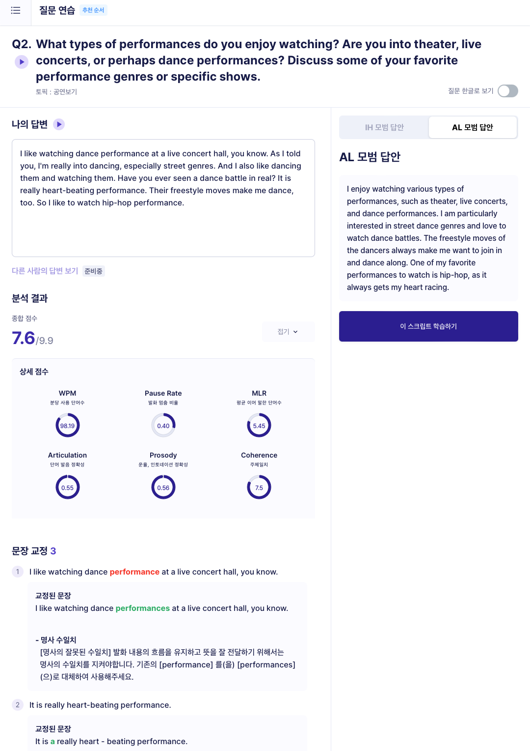 '연습하기'를 클릭하면 각 질문들에 대한 내 답변들을 볼 수 있다. 녹음했던 내용들이 그대로 나온다...^^....부끄렁.