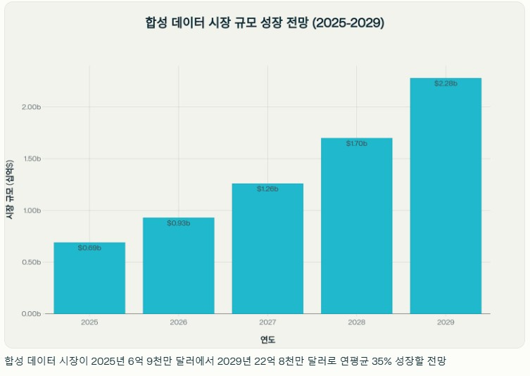 글로벌 합성 데이터 시장은 2025년 6억 9천만 달러에서 2029년 22억 8천만 달러로 연평균 35% 성장할 것으로 전망된다. 가트너는 2028년까지 AI 학습에 필요한 데이터의 80%를 합성 데이터가 차지할 것으로 예측했다. AI 연구기관 에포크AI에 따르면 2026년부터 AI 학습용 고품질 데이터가 소진되기 시작할 전망이다. 현재 인터넷상 고품질 데이터는 전체의 10%에도 못 미치며, 저작권 문제로 활용 가능한 데이터는 더욱 제한적이다.