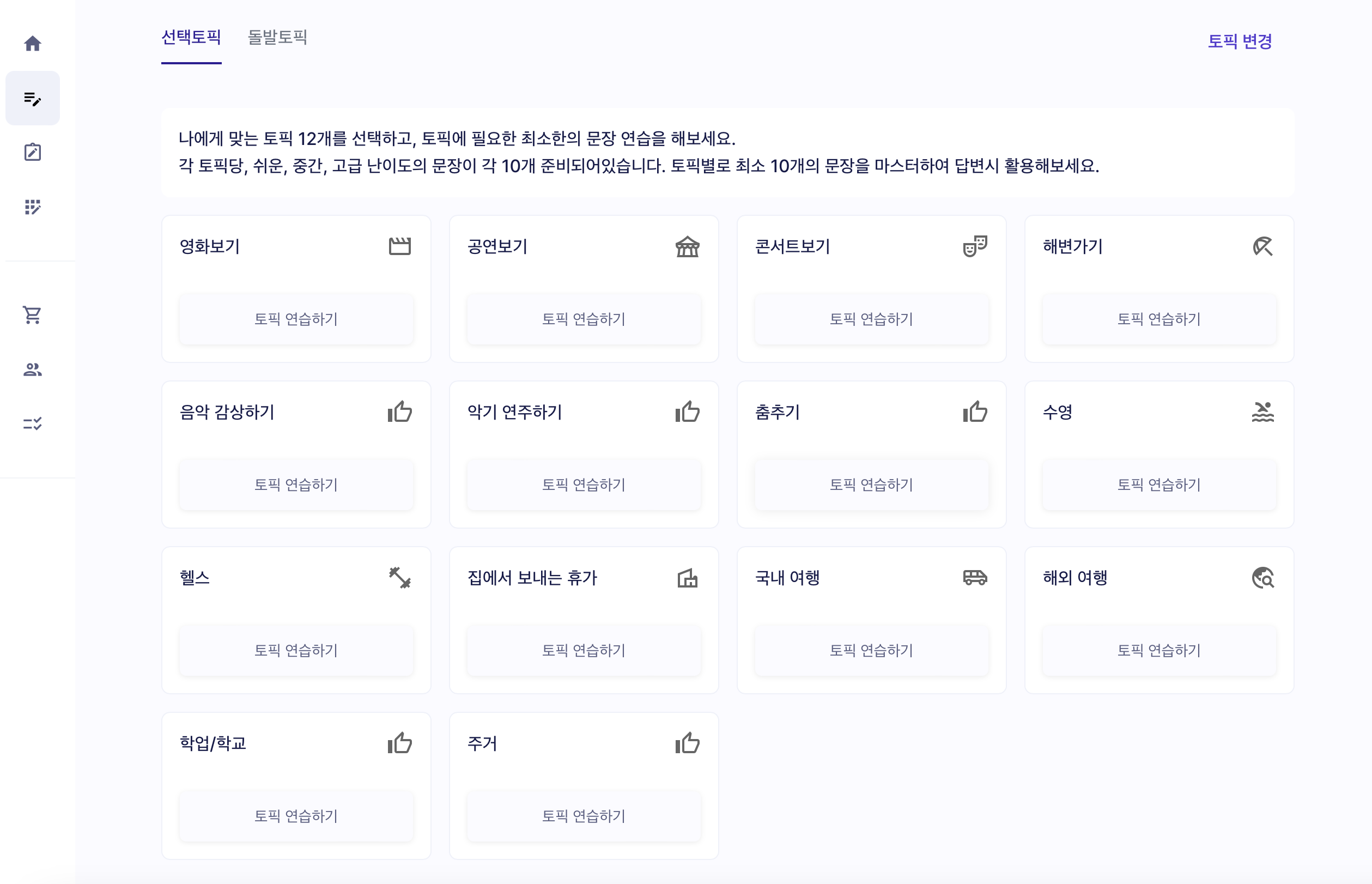 토픽별로 에피소드 하나에 대해 정갈하게 말하는 연습을 하며 입을 풀어주었다.
