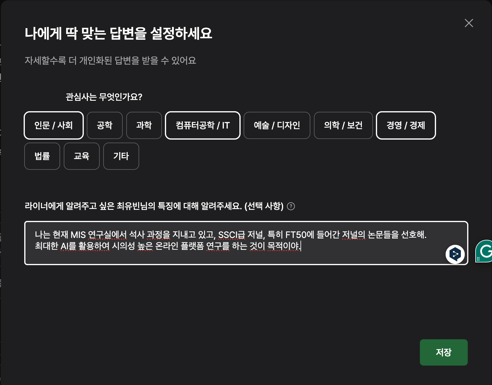 아직 길게는 사용해보지 못했지만, 다른 GenAI 는 아이디어를 '발산'하는 느낌임에 비해 Liner는 확실히 academic한 novelty를 가장 많이 신경써서 아이디어를 내놓는 느낌이다.