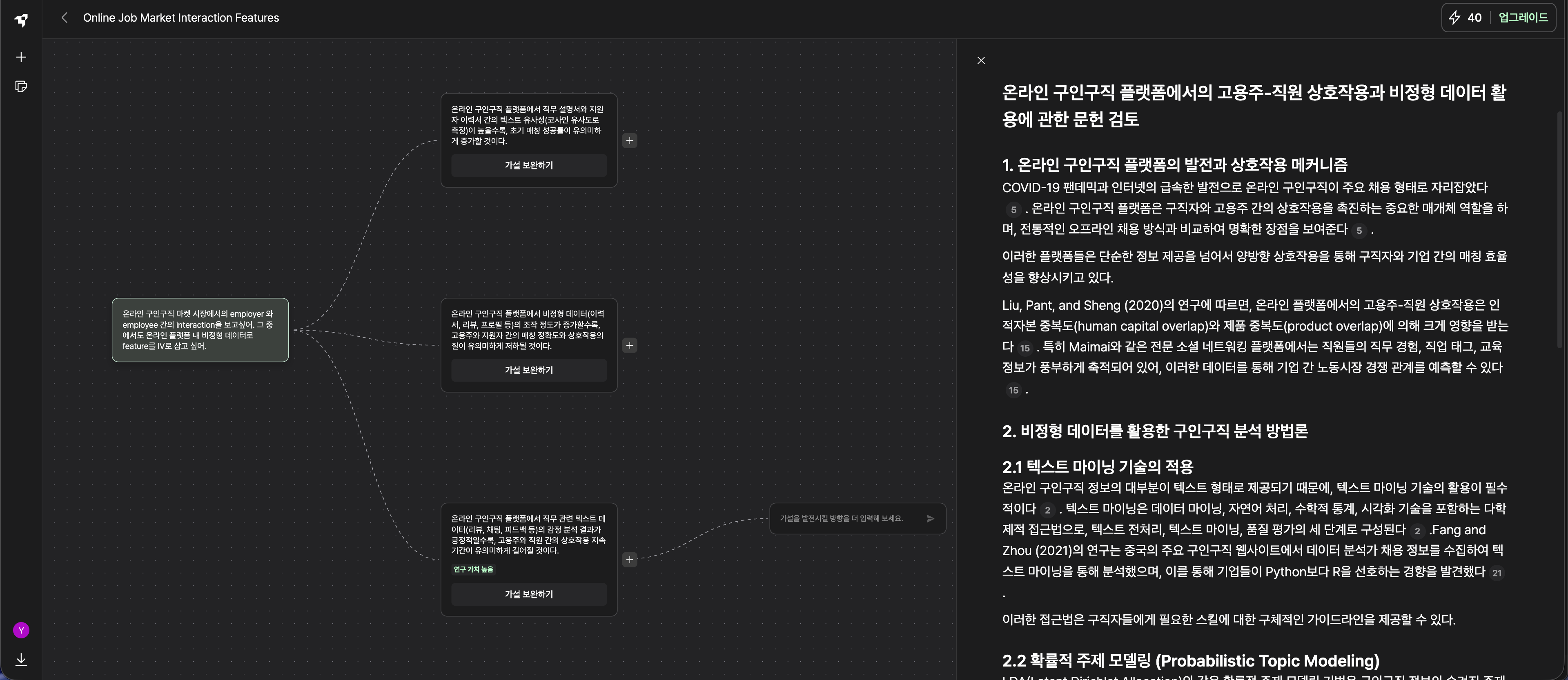 이렇게 나의 Query 에 대해 다방면으로 분석한 리포트를 작성해주고, 마인드맵 형태로 가설을 제안해준다.